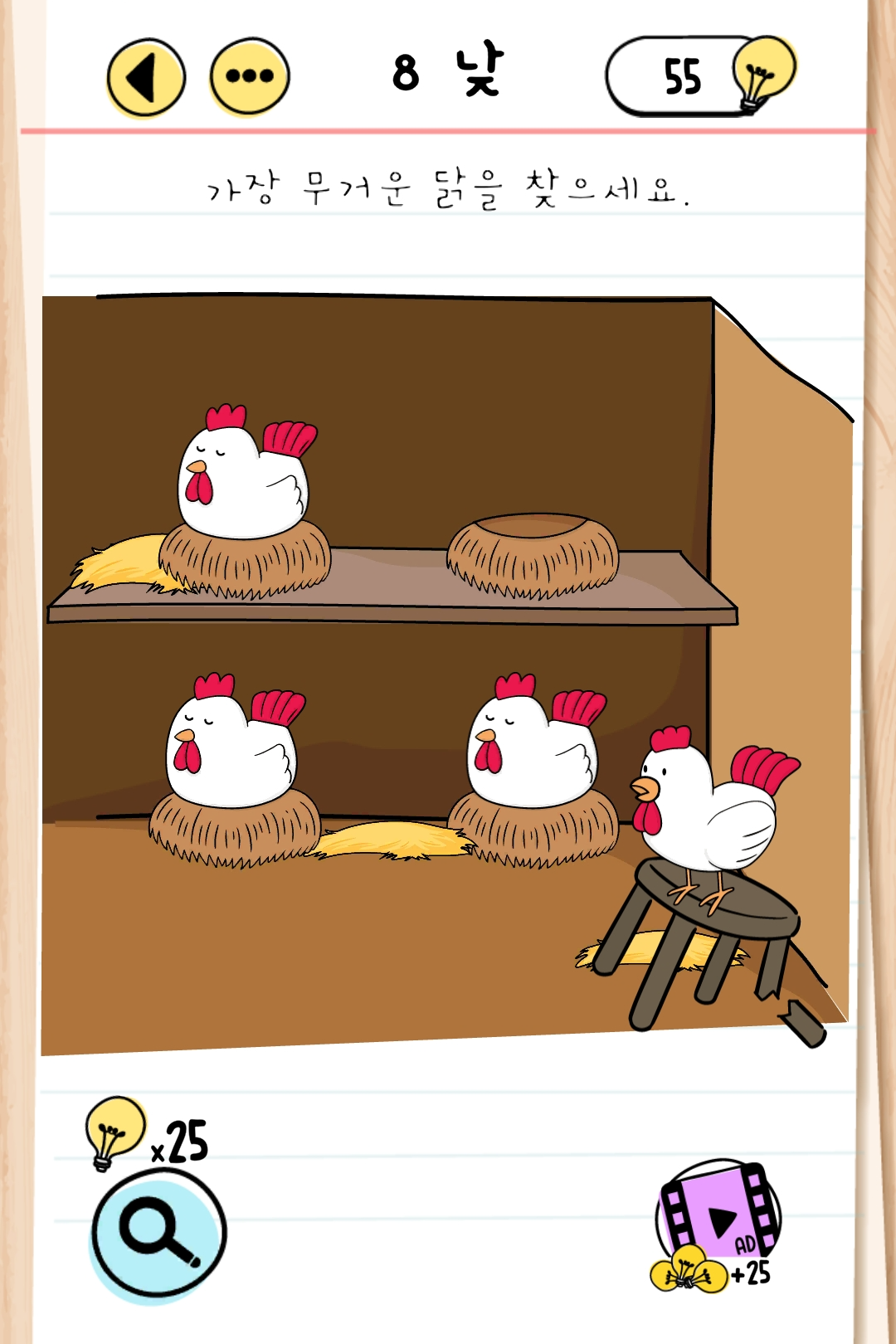 두 번째 닭이 무거운지 의자가 부러졌어요.